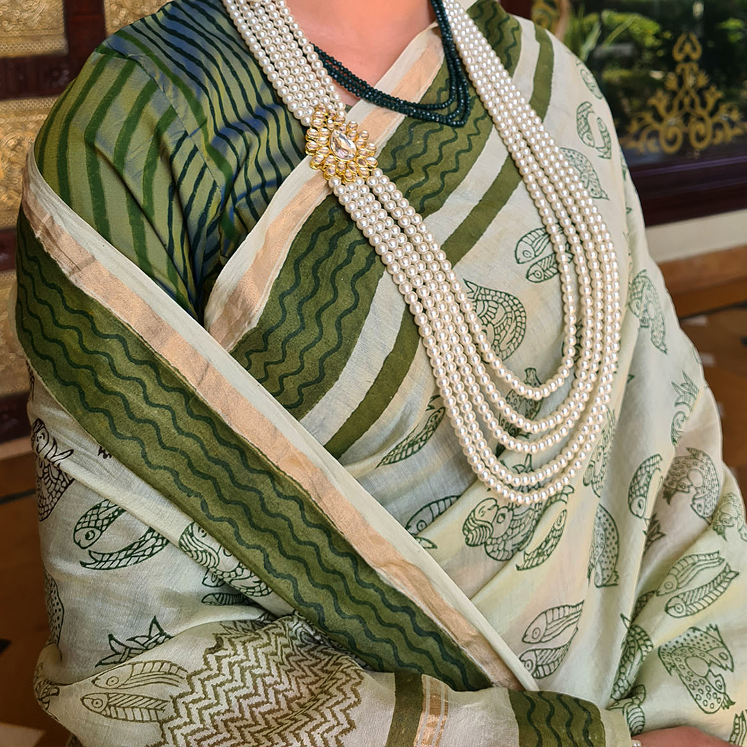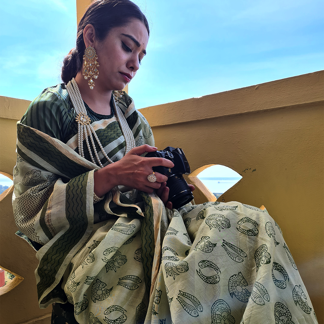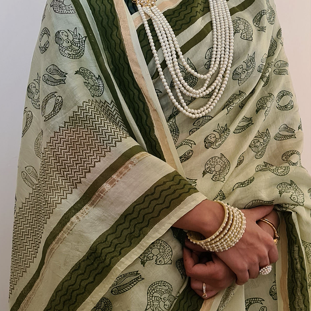 - Description: Light Green Chanderi Handloom Saree with Dark Green Handblock Print. This graceful Chanderi handloom saree features a soft light green base, adorned with detailed dark green handblock prints. The motifs, inspired by Tribal Gond art, showcase stylized fish—symbols often associated with nature, harmony, and cultural storytelling. Woven in fine Chanderi fabric, the saree is lightweight, breathable, and offers an elegant drape, making it a perfect choice for both everyday elegance and special occasions. Comes with a matching blouse piece.