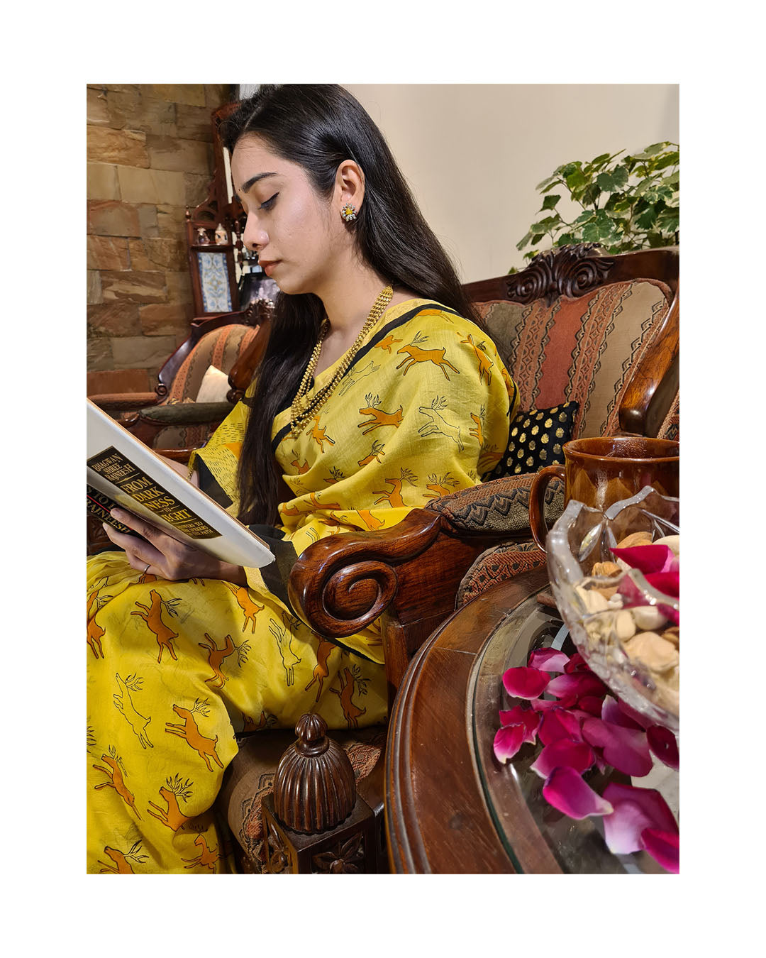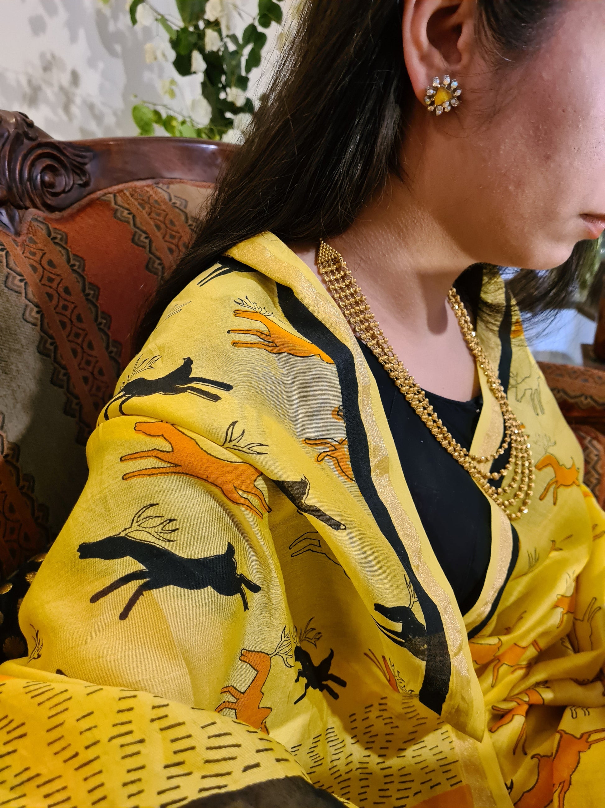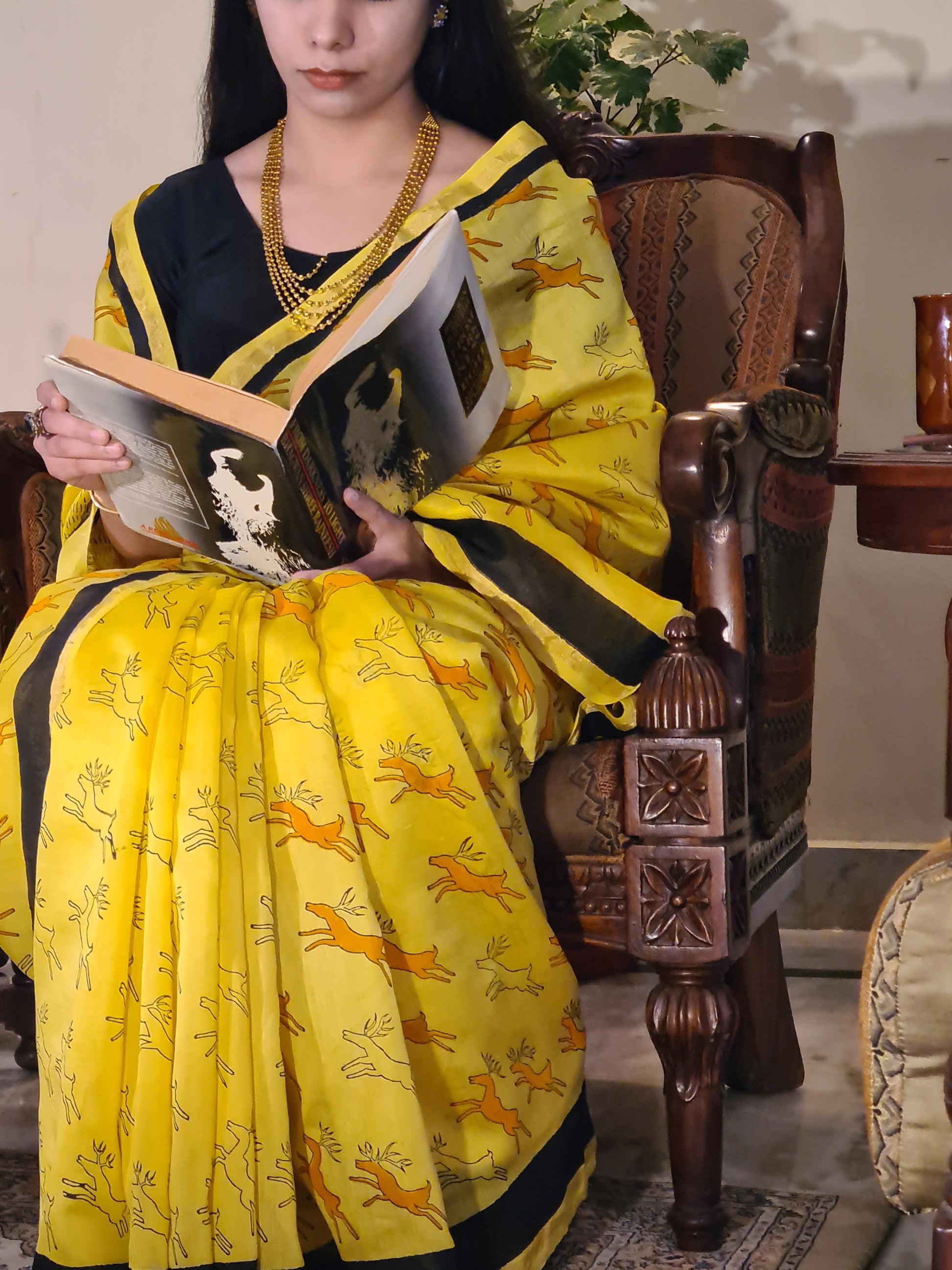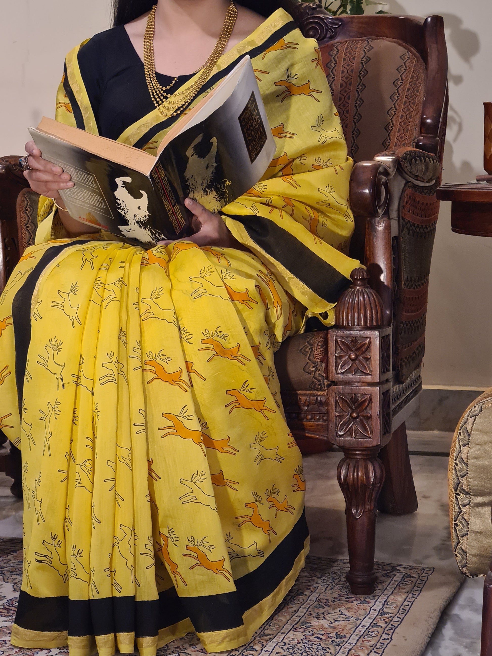 - Description: Yellow Chanderi Handloom Saree with Black Handblock Print Bright and elegant, this yellow Chanderi handloom saree features striking black handblock prints of stylized deer motifs. The design draws from traditional craftsmanship, adding a touch of cultural charm to the contemporary silhouette. Made from lightweight and breathable Chanderi fabric, it offers a soft texture and fluid drape—perfect for festive occasions, daytime functions, or graceful everyday wear. Includes a matching blouse piece.